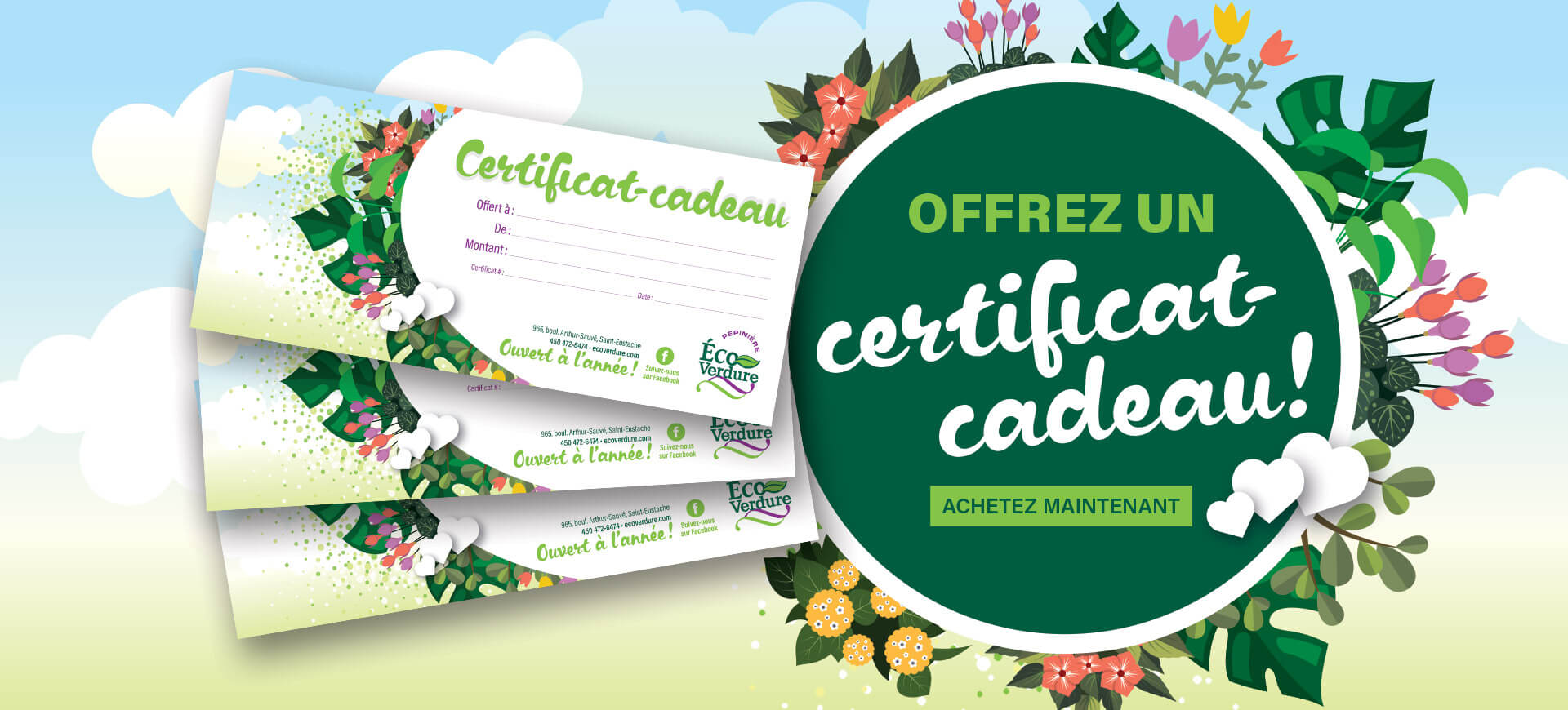 Un ami ou un membre de votre famille a le pouce vert? Vous ne connaissez absolument rien à ce sujet et ne savez quoi lui procurer? Offrez-lui un de nos certificats-cadeaux!